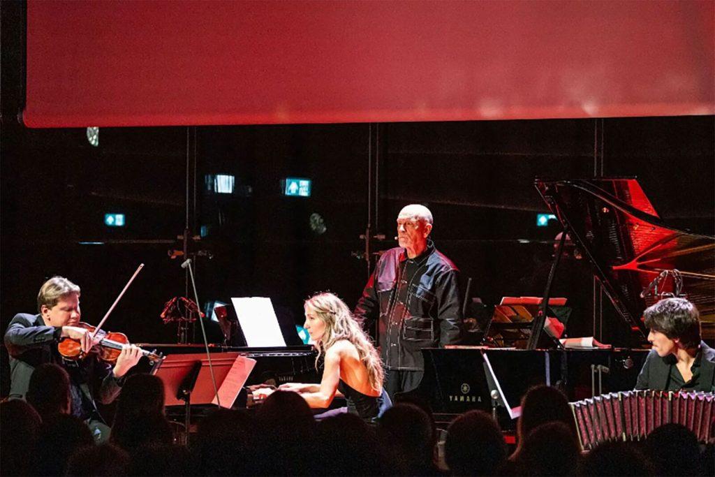 La escena comienza con la música de Piazzolla ejecutada por Anastasia Terenkova en piano, Fabrizio Colombo en bandoneón y Andre Bielow en violín. Del techo empiezan a caer papelitos hacia el proscenio, caen de manera imperceptible, intermitente. Sólo después de escuchar el texto en boca del narrador John Malkovich comprendo el guiño.