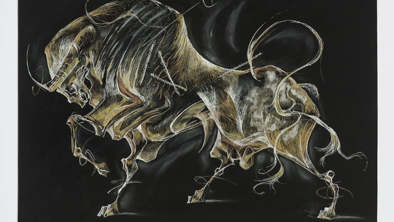 «La guerra se rinde ante el amor». Así define Marco Antonio Carcavilla Portolés el sentimiento estético que anima a su serie de toros pintados con técnica mixta (tinta gel, acrílico y pastel seco) sobre papel murillo texturado, y la cual se exhibirá desde este miércoles 28 de marzo hasta el próximo 11 de abril, en la sala El Greco del Estadio Español de Santiago.