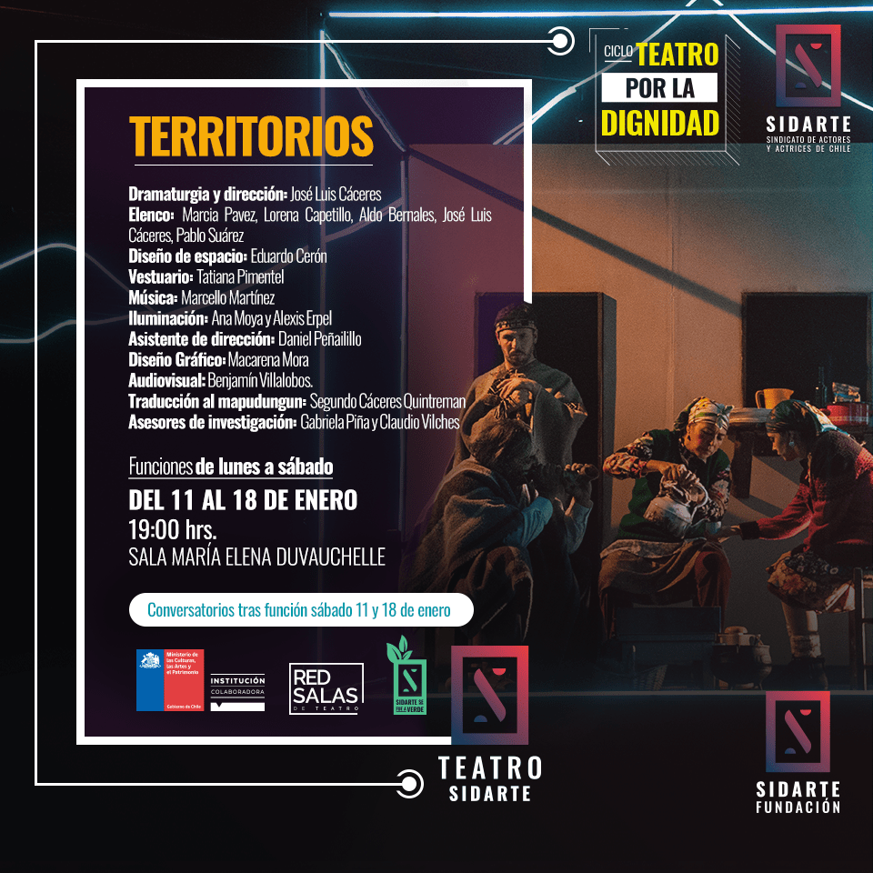 Territorios se exhibió entre el 11 y 18 de enero en la sala María Elena Duvauchelle del Teatro Sidarte (ubicado en calle Ernesto Pinto Lagarrigue Nº 131, Barrio Bellavista). Las entrada tuvieron un valor general de $6.000, estudiantes y tercera edad a $4.000 y jueves popular a $3.000.